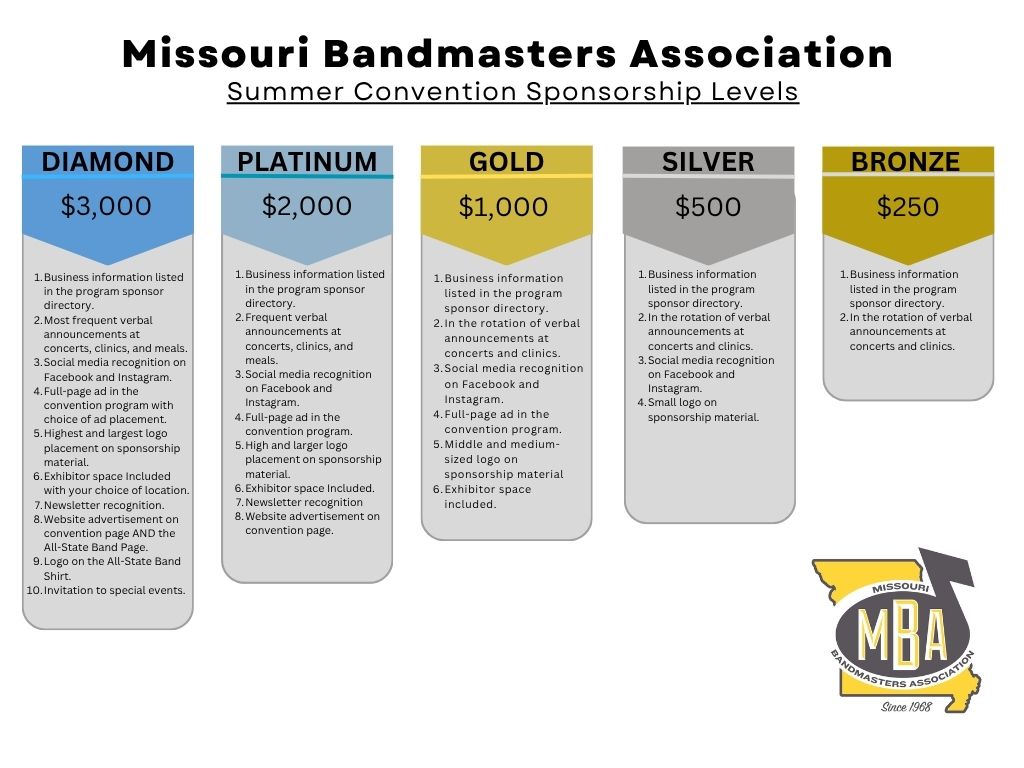We would like to invite you to become a Sustaining Member of the Missouri Bandmasters Association. The fee is one hundred and fifty dollars ($150.00) and includes recognition as an exhibitor in the convention program. Please note that this membership level does not include a display table at the convention. Sustaining Membership in our organization also gives you full access to our members through the MBA website to build your business contacts with educators across Missouri. We will accept Visa and Master Card credit cards ONLY or payment.